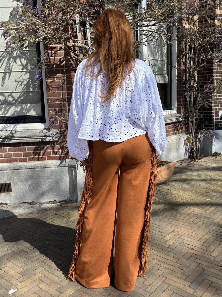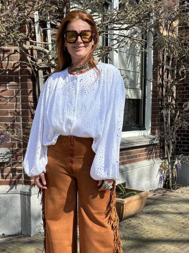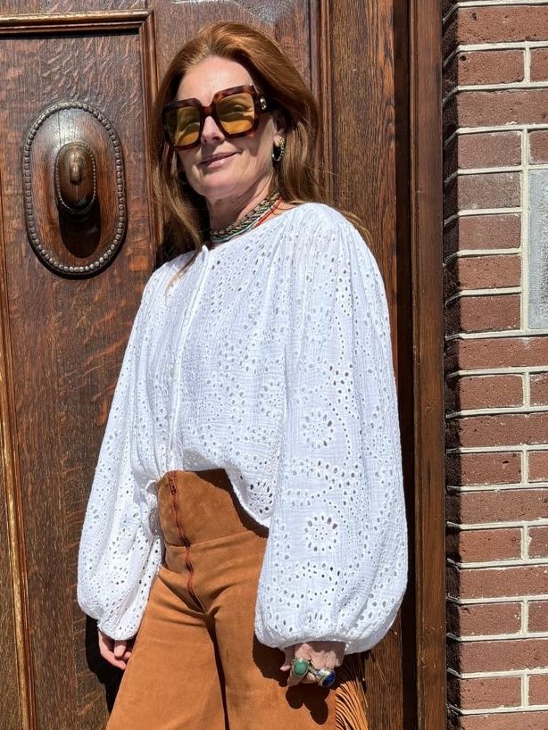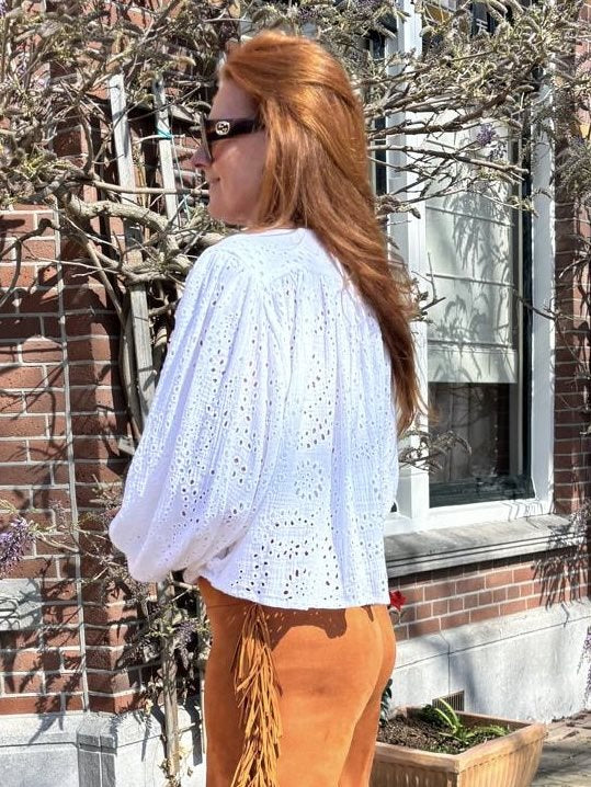 Dreamer Chloé in full embroidery. 100% katoen allover embroidery. Bloesend model, ballonmouw. Easy fit, vrouwelijke shape.