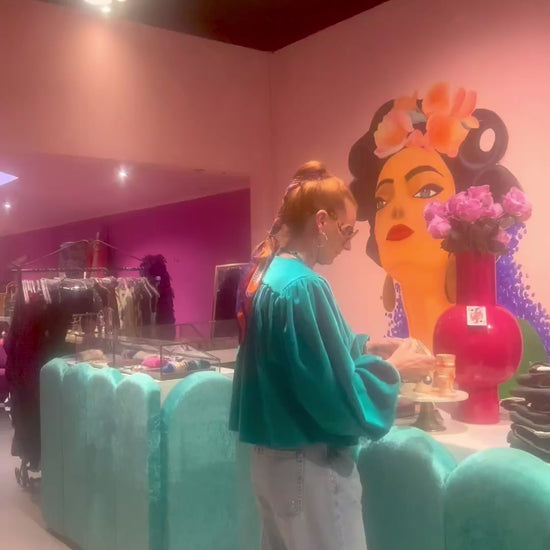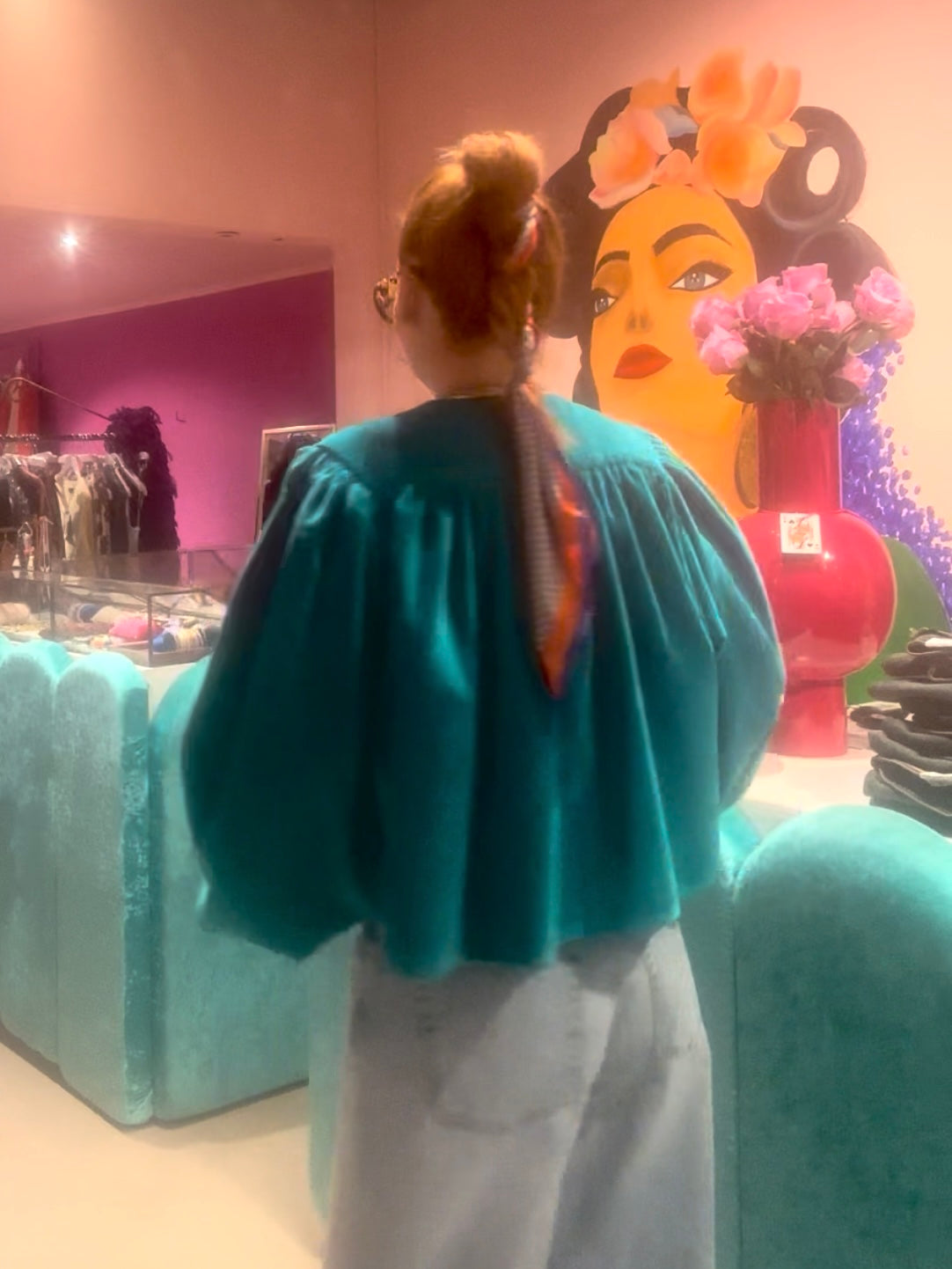 Met ballonmouwen en in een luxe velvet stof in een prachtige smaragdgroene tint.