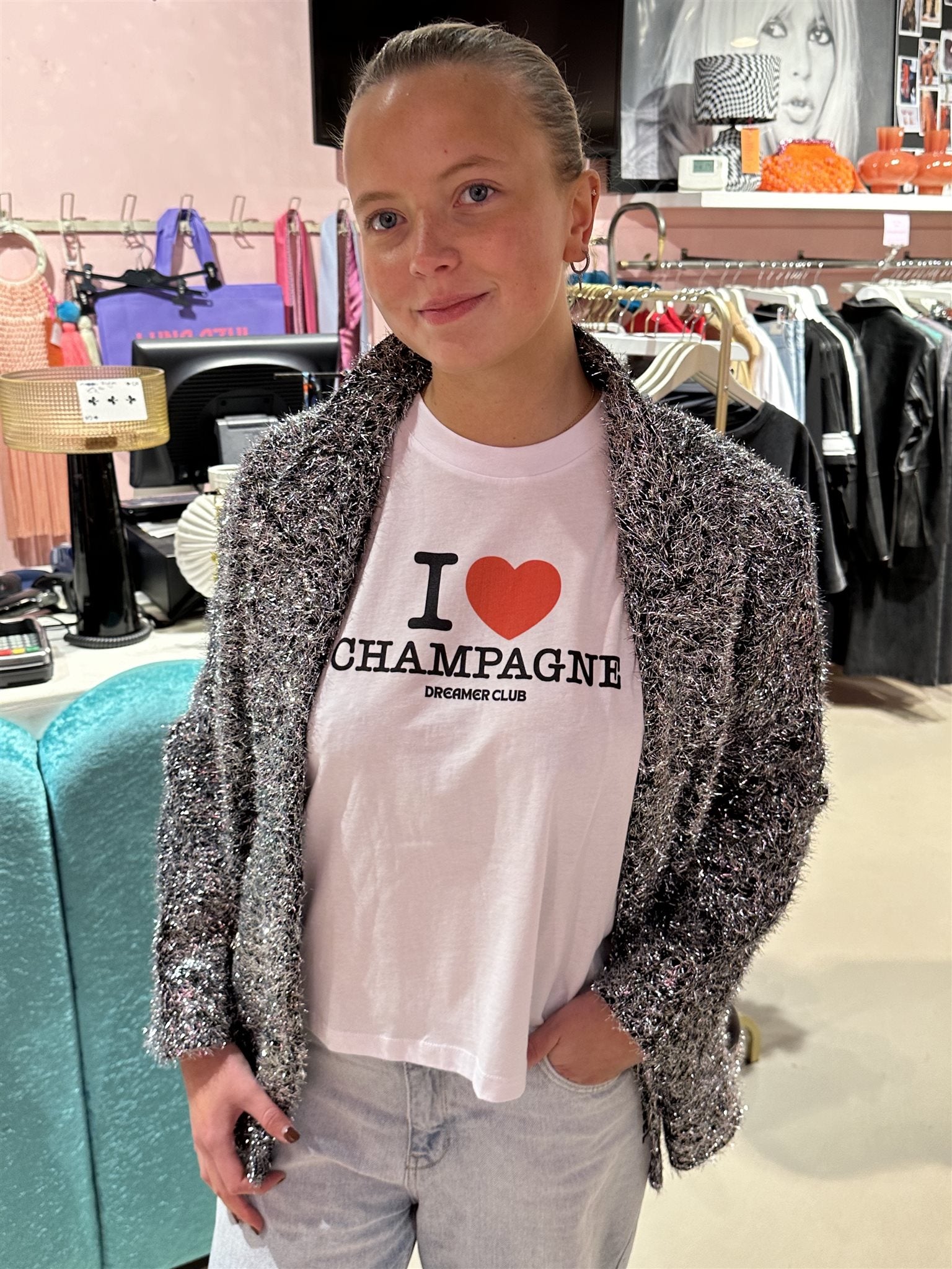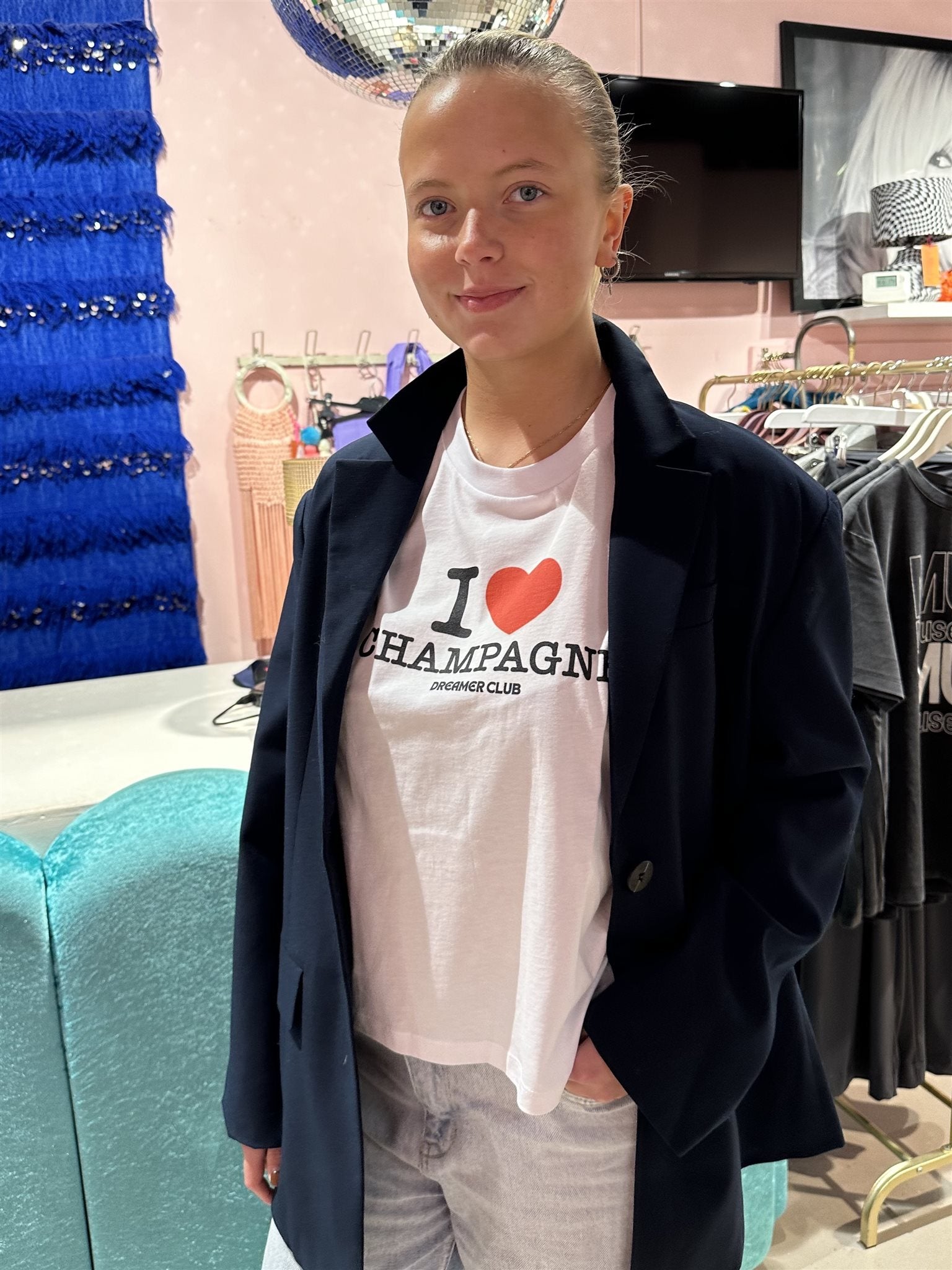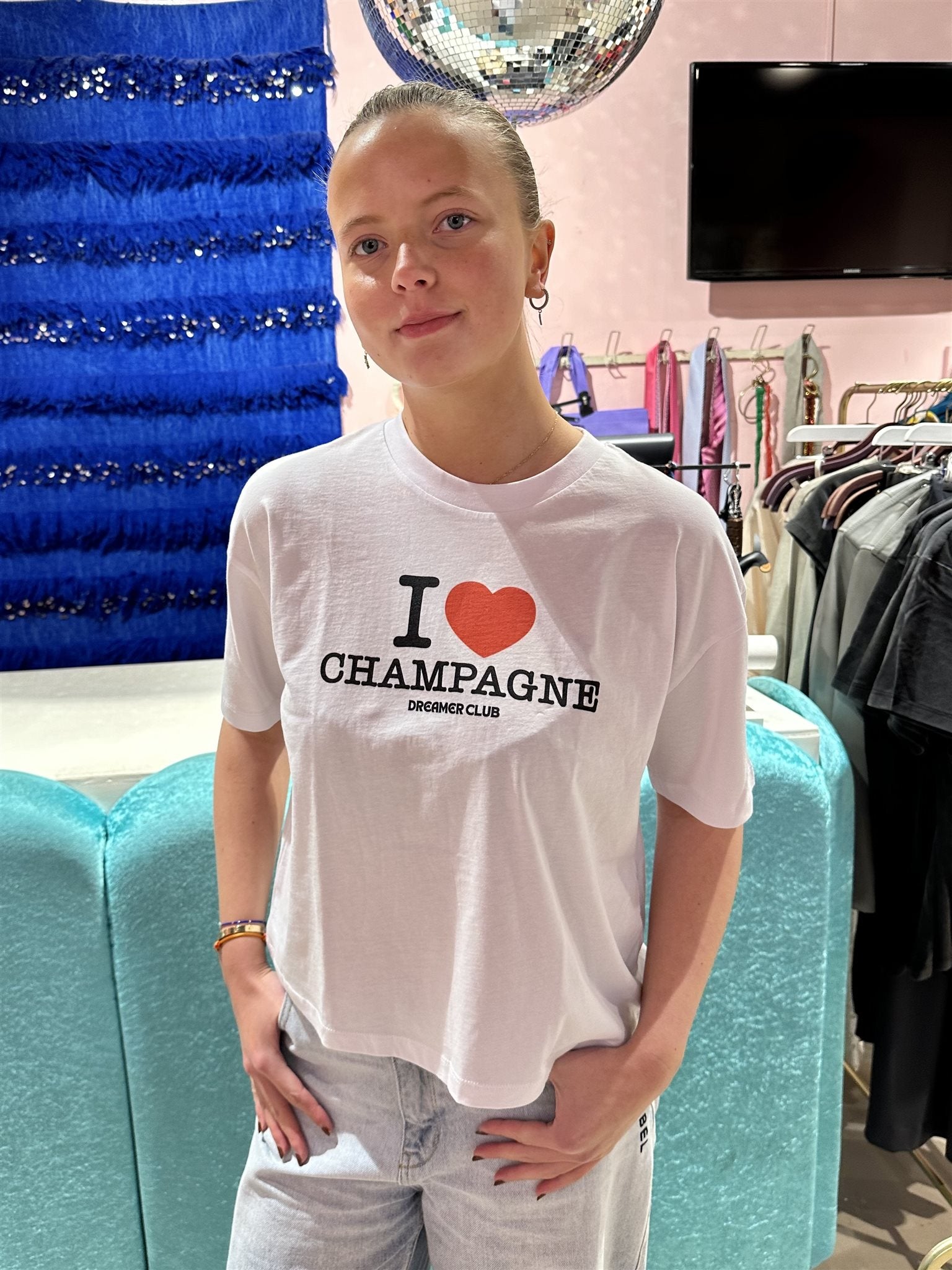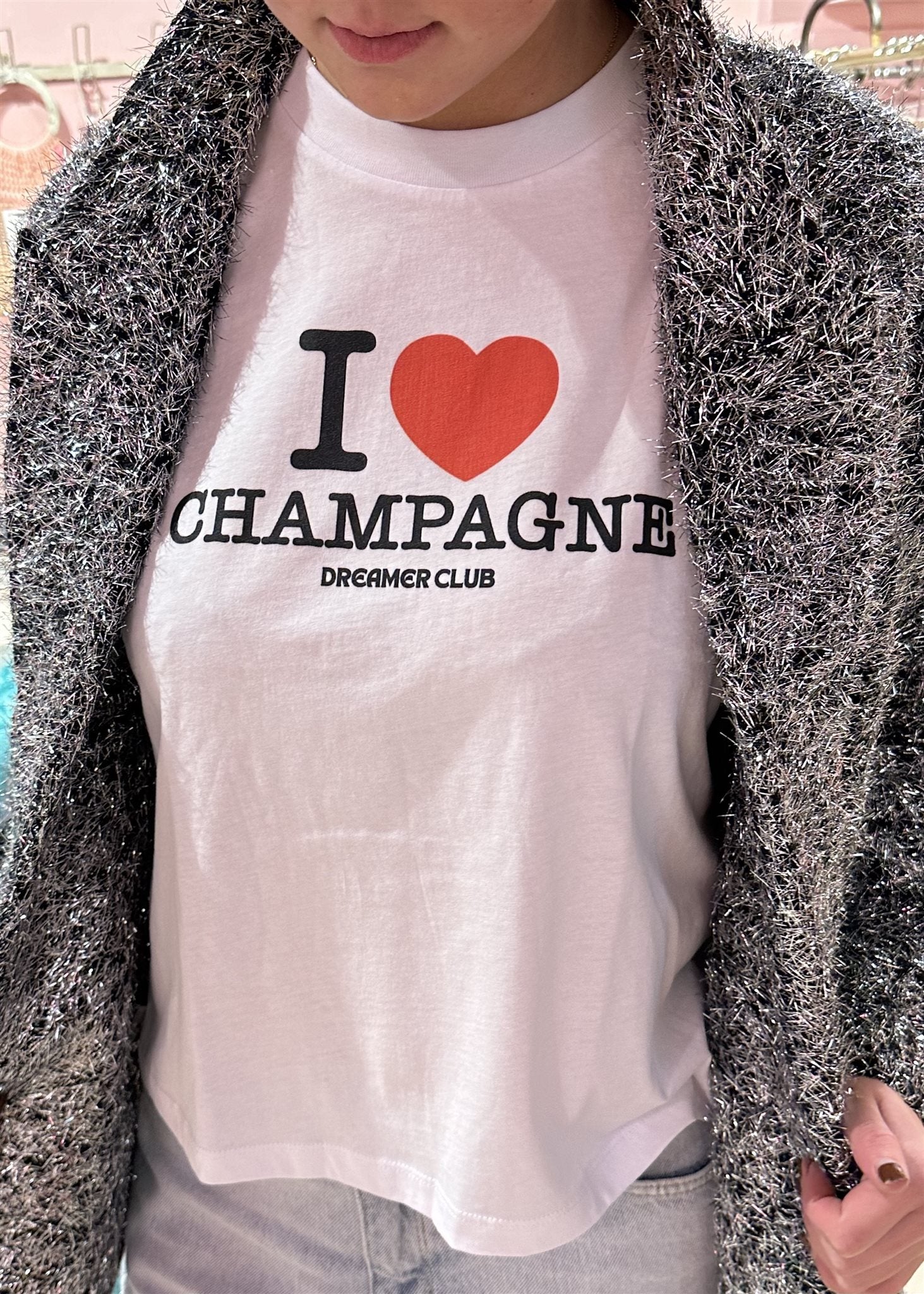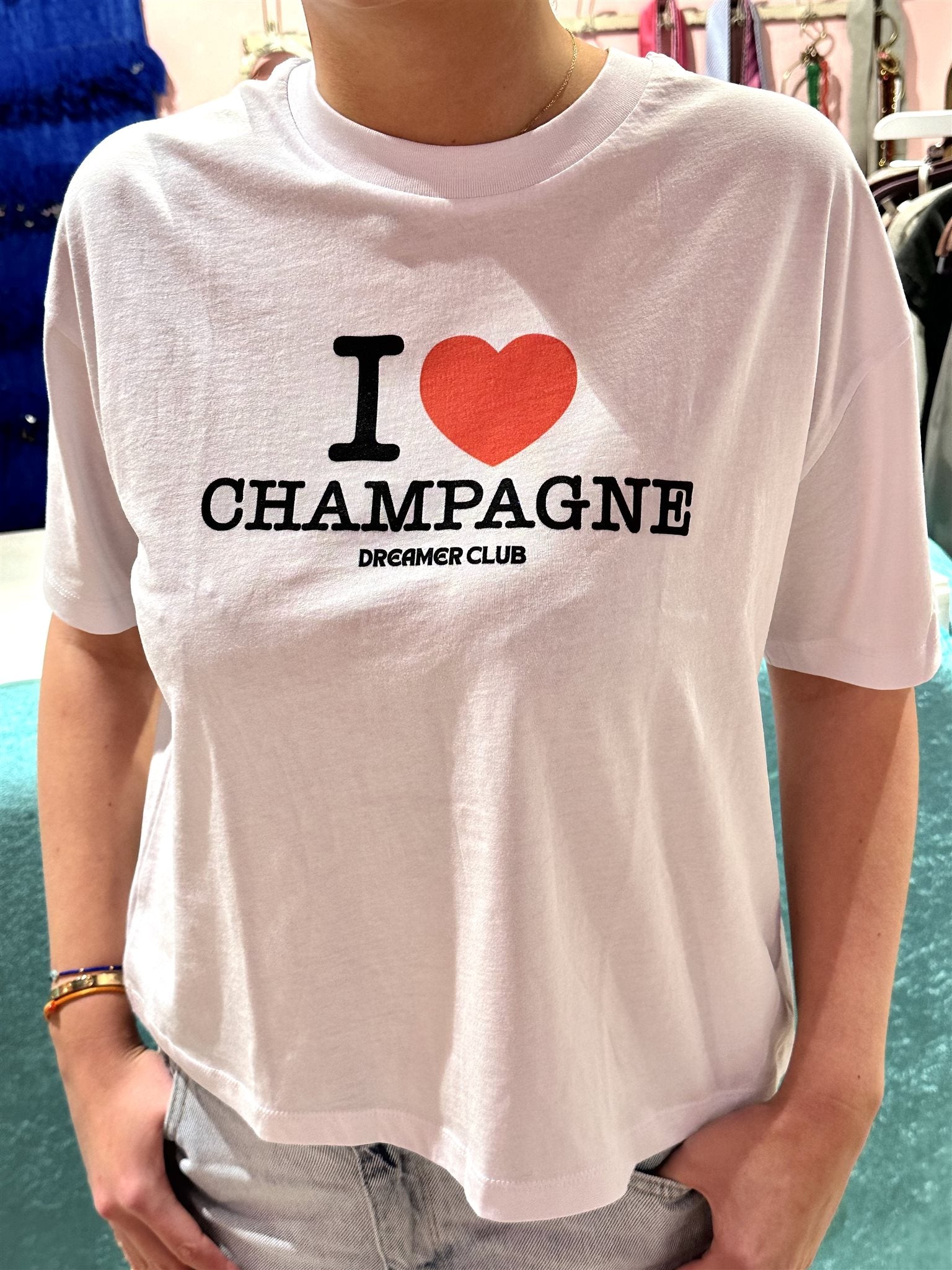 Dreamer "I Love Champagne" Tee! Crafted from soft eco-friendly cotton, this iconic white T-shirt is a must-have for every Dreamer. Perfect for every occasion: Casual Chic: Style it with a tailored blazer and wide-leg trousers for an effortless, polished look. Rock Vibes: Pair it with ripped jeans, a leather jacket, and boots for edgy, rebellious flair. Timeless, original, and full of sparkle – just like you. Model is size 36 and wearing size M, the style is a little cropped and loosefit.